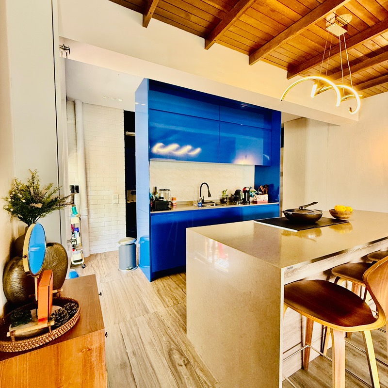 🍳 Showpiece Kitchen – Sleek glossy-blue cabinetry, quartz counters, built-in oven, and social island dining.